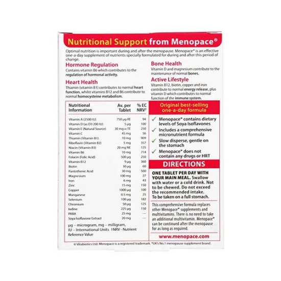 قرص منوپیس اورجینال ویتابیوتیکس یک مولتی ویتامین تخصصی برای دوران یائسگی است که با ترکیبات منحصربهفرد خود به حفظ سلامت بانوان در این دوره حساس کمک میکند. این مکمل با دارا بودن ایزوفلاونهای سویا، سلنیوم، ویتامینهای A، C، E، اسید فولیک و 21 ماده مغذی ضروری، به کاهش علائم یائسگی مانند گرگرفتگی، تعریق شبانه، نوسانات خلقی و خشکی پوست میپردازد.
