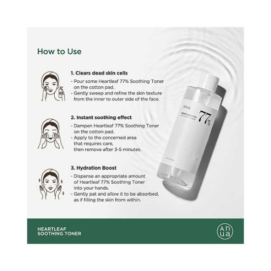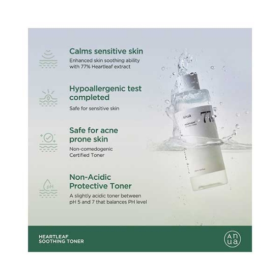 تونر آبرسان و ضد لک آنوا (Anua Heartleaf 77% Soothing Toner) یک محصول مراقبت از پوست با فرمولاسیون پیشرفته است که برای تسکین پوستهای تحریکشده، آبرسانی عمیق و کاهش التهابات پوستی طراحی شده است. این تونر با ترکیبات گیاهی قدرتمند مانند عصاره هارتلیف (77%)، سنتلا آسیاتیکا و بابونه، به رفع قرمزی، درمان آکنه، اگزما و روزاسه کمک میکند و پوستی شفاف و متعادل را برای شما به ارمغان میآورد.