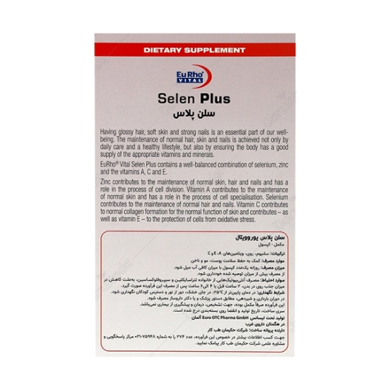 کپسولهای سلن پلاس یوروویتال (که گاهی به اشتباه "قرص" خوانده میشوند) با استانداردهای دقیق و تحت لیسانس Euro OTC Pharma GmbH آلمان فرموله شدهاند. این محصول توسط شرکت داروسازی دانا در ایران تولید و بستهبندی میشود که تضمینی بر رعایت استانداردهای دقیق کنترل کیفیت است. نماینده انحصاری این برند در ایران شرکت حکیمان طب کار میباشد. هر جعبه مقوایی این محصول حاوی ۶۰ کپسول نرم ژلاتینی است که برای یک ماه مصرف کافی میباشد.